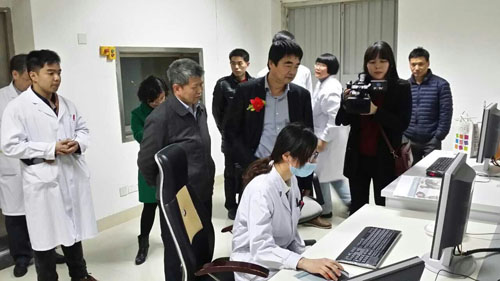 儀式較后,各位領(lǐng)導(dǎo)共同為西門子3T核磁共振開機(jī)儀式剪彩。隨后一行人來到放射科,觀看西門子3T核磁共振的開機(jī)。