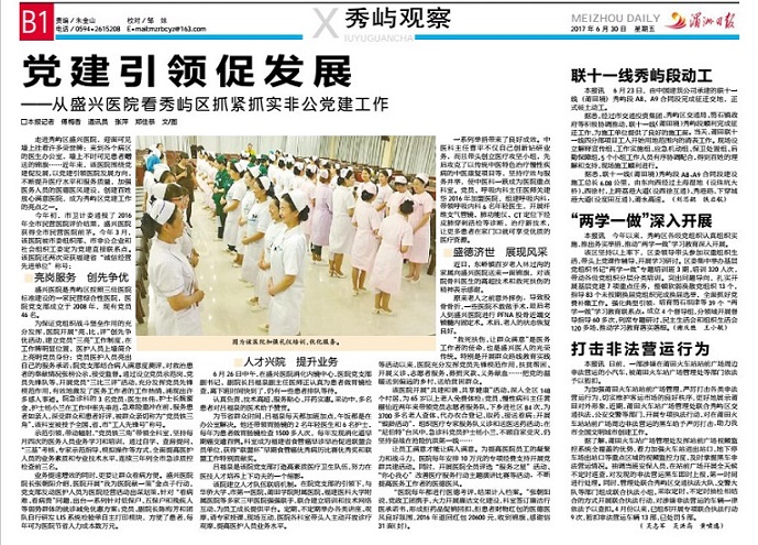 前言:盛興醫(yī)院是秀嶼區(qū)按照三級(jí)醫(yī)院標(biāo)準(zhǔn)建設(shè)的一家民營(yíng)綜合性醫(yī)院,現(xiàn)有員工516人。醫(yī)院黨支部成立于2008年12月,現(xiàn)有黨員46名,其中正式黨員14名、預(yù)備黨員4名、“雙報(bào)到”黨員28名。醫(yī)院黨支部成立以來(lái),緊緊圍繞黨建促發(fā)展,構(gòu)筑四個(gè)平臺(tái),發(fā)揮四個(gè)作用,提升醫(yī)院服務(wù)水平。醫(yī)院先后被省、市、區(qū)誠(chéng)信促進(jìn)會(huì)授予誠(chéng)信企業(yè)先進(jìn)單位;被市總工會(huì)授予先進(jìn)職工小家和職工書屋;急診科先后被全國(guó)、省、市總工會(huì)授予“工人先鋒號(hào)”;重癥醫(yī)學(xué)科被省總工會(huì)授予“五一巾幗標(biāo)兵崗” 等榮譽(yù)稱號(hào)。今年3月被市委組織部、市非公企業(yè)和社會(huì)組織工委定為黨建直接聯(lián)系點(diǎn)。