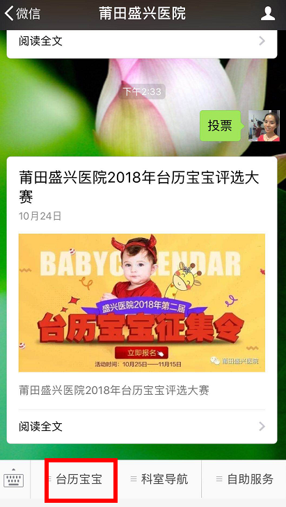 2、從圖文消息或菜單欄找到“臺歷寶寶”后,按照提示上傳“照片+姓名+聯(lián)系電話+參賽宣言”,主辦方審核通過后形成投票專屬頁面。電話號碼請?zhí)顚懻鎸?shí)號碼,以便領(lǐng)獎,我們將嚴(yán)格保護(hù)參賽對象的各項(xiàng)資料)